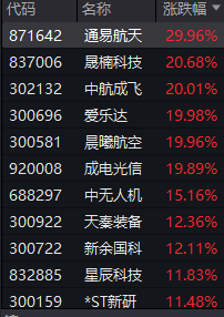 从板块来看,航天军工一路走高,领涨市场。其中,通易航天、晟楠科技、中航成飞、爱乐达、晨曦航空、航天彩虹、建设工业、奥普光电、内蒙一机等多只个股涨停。中无人机、天秦装备、新余国科、星辰科技、*ST新研、新光光电等涨超10%。