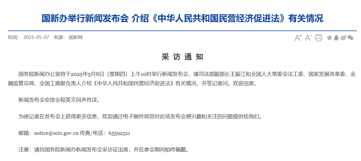 【大河财立方消息】5月7日,国新办预告,国务院新闻办公室将于5月8日(星期四)上午10时举行新闻发布会,司法部副部长王振江和全国人大常委会法工委、国家发展改革委、金融监管总局、全国工商联负责人介绍《中华人民共和国民营经济促进法》有关情况,并答记者问。