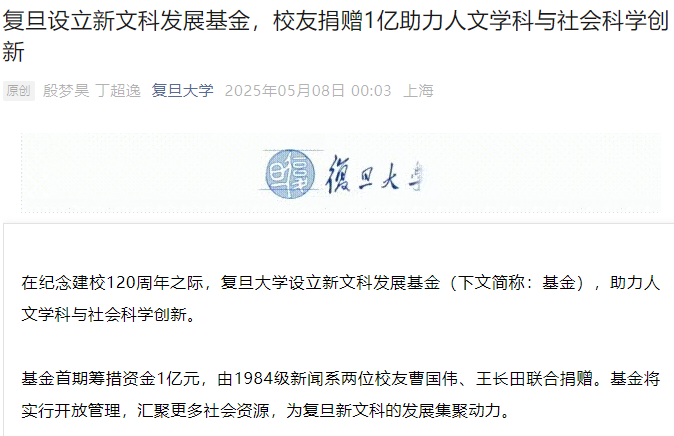 【大河财立方消息】5月8日,复旦大学宣布,在纪念建校120周年之际,设立新文科发展基金,助力人文学科与社会科学创新。