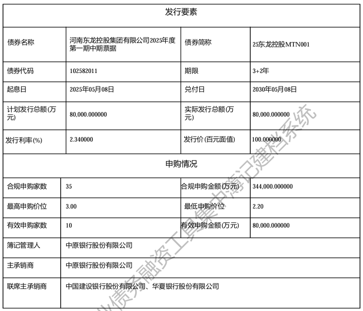 起息日为2025年5月8日,兑付日为2030年5月8日。主承销商及簿记管理人为中原银行,联席主承销商为中国建设银行、华夏银行。募集资金全部用于偿还发行人存量债务融资工具本金。
