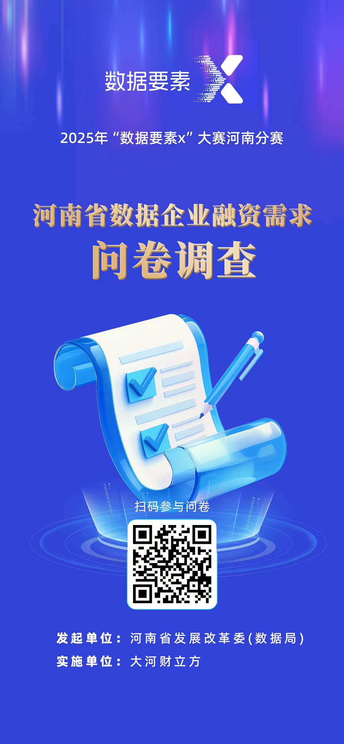 5月9日,2025年“数据要素×”大赛河南分赛动员大会举行。河南省发展改革委(数据局)和大河财立方联合发起的《河南省数据企业融资需求问卷调查》同步启动,诚邀全省各类数据企业相关负责人共同填答,希望据此真实了解现阶段河南数据企业的发展情况与融资需求,破解企业融资难题。