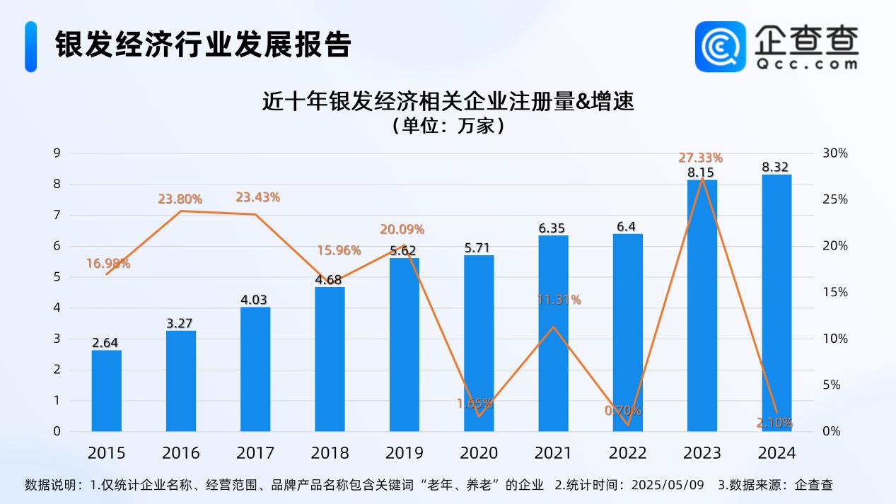 【大河财立方 记者 杨霄】国内 “银发经济” 正迎来蓬勃发展期,连直播带货领域的网红们也纷纷瞄准这片蓝海市场。5月9日,企查查发布的大数据显示,今年前四个月,国内新增银发经济相关企业2.88万家,同比增长约9.27%。而2024年,全国全年注册8.32万家相关企业,同比增长2.10%。不难发现,国内对银发经济的投资及企业注册进入了高增长周期。
