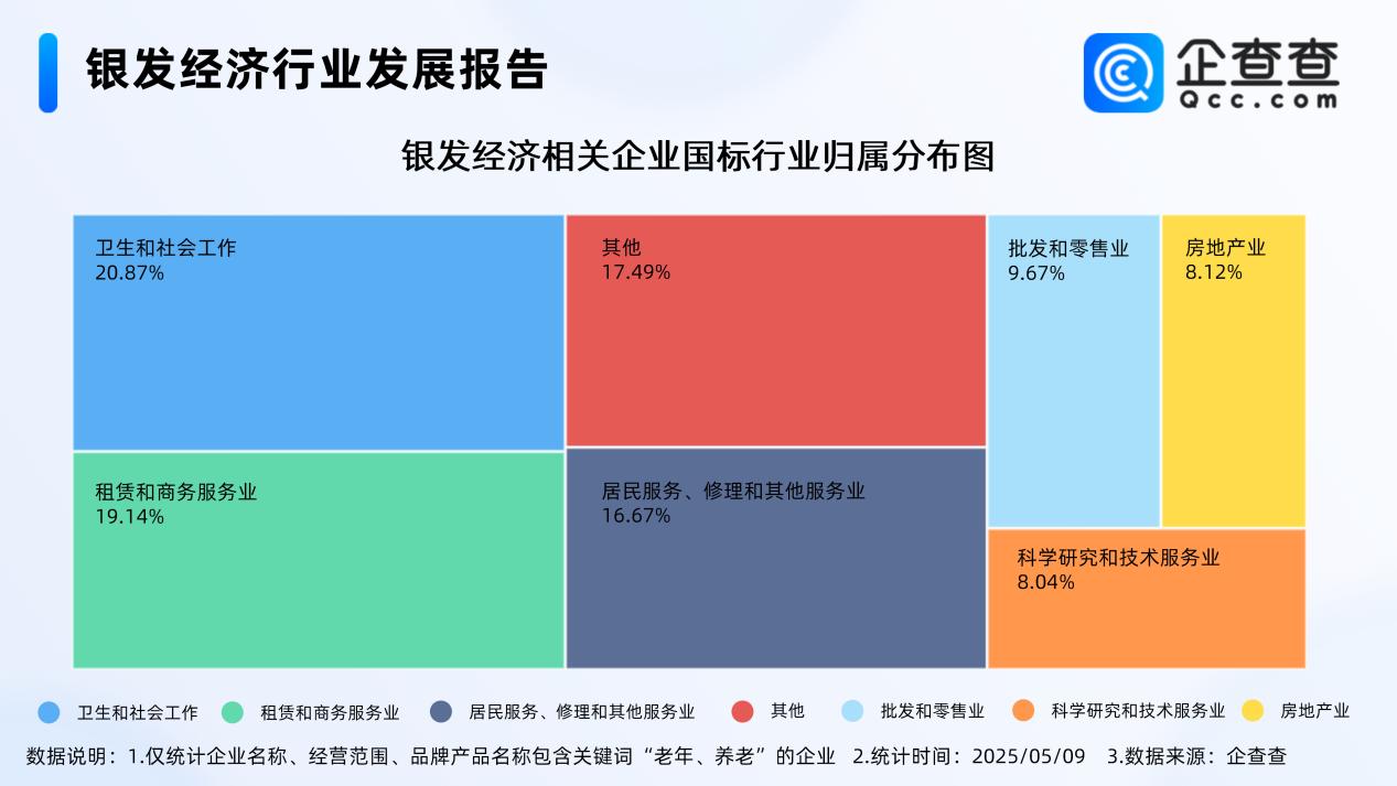 另从国标行业分布来看,银发经济相关企业主要集中在卫生和社会工作(占比20.87%)、租赁和商务服务业(占比19.14%)、居民服务、修理和其他服务业(占比16.67%)这三大行业,同时也广泛分布于批发和零售业、房地产业等领域。
