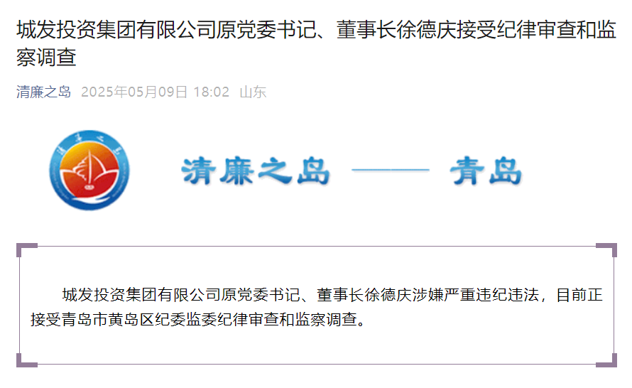 城发投资集团有限公司原党委书记、董事长徐德庆涉嫌严重违纪违法,目前正接受青岛市黄岛区纪委监委纪律审查和监察调查。