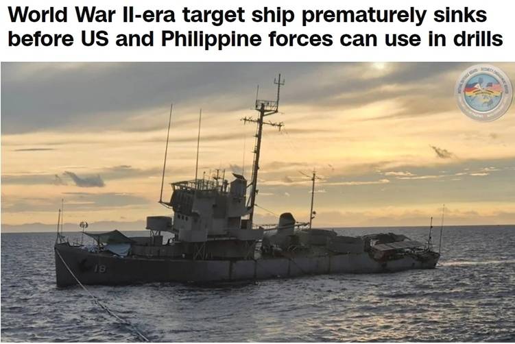 在作秀过程中,菲律宾海军想要利用老旧的护卫舰进行演习,这种护卫舰吨位非常小,是二战期间遗留下来的装备。当时菲军也没有认真了解海况,气象信息掌握得不充分,结果靶船自己沉没了。该事件对于实战化演习肯定会产生负面影响。