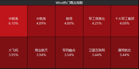从板块来看,今日早盘,航天军工板块强势拉升,领涨两市。Wind数据显示,截至午间收盘,航天军工指数上涨4.72%。