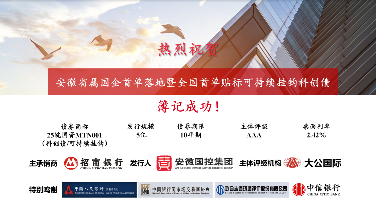 【大河财立方消息】5月14日,据安徽国控集团消息,5月13日晚,安徽国控集团在银行间市场成功簿记发行全国首批科技创新债券。作为安徽省属国企首单落地暨全国首单贴标可持续挂钩的科创债,该笔债券发行金额5亿元,期限10年,票面利率2.42%。