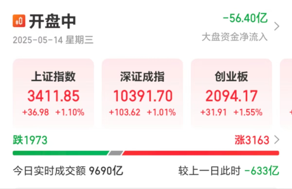 【大河财立方消息】5月14日午后,指数持续走高,三大股指均涨超1%。大金融、港口航运、物流、化工等方向涨幅居前,沪深京三市上涨个股超3100只。