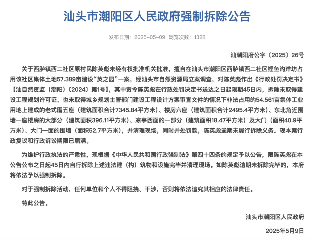 公告显示,因擅自在西胪镇西二社区鲤鱼沟洋坊占用该社区集体土地建设“英之园”一案,经汕头市自然资源局立案调查,对陈英彪作出《行政处罚决定书》【汕自然资监(潮阳)〔2024〕第1号】 ,其中责令陈英彪在行政处罚决定书送达之日起限期45日内,拆除未取得建设工程规划许可证、也未取得城乡规划主管部门建设工程设计方案审查文件的情况下非法占用的54.561亩集体工业用地上建成的老式厝五座(建筑面积合计7345.84平方米)、楼房六座(建筑面积合计2495.4平方米)、东北角近围墙一座楼房的大部分(建筑面积396.11平方米)、凉亭西面的一部分(建筑面积18.47平方米)及大门(面积40.9平方米)、大门一面的围墙(面积52.7平方米),并清理现场,同时并处罚款,陈英彪逾期未履行拆除义务。现本案行政复议和行政诉讼期限已届满。