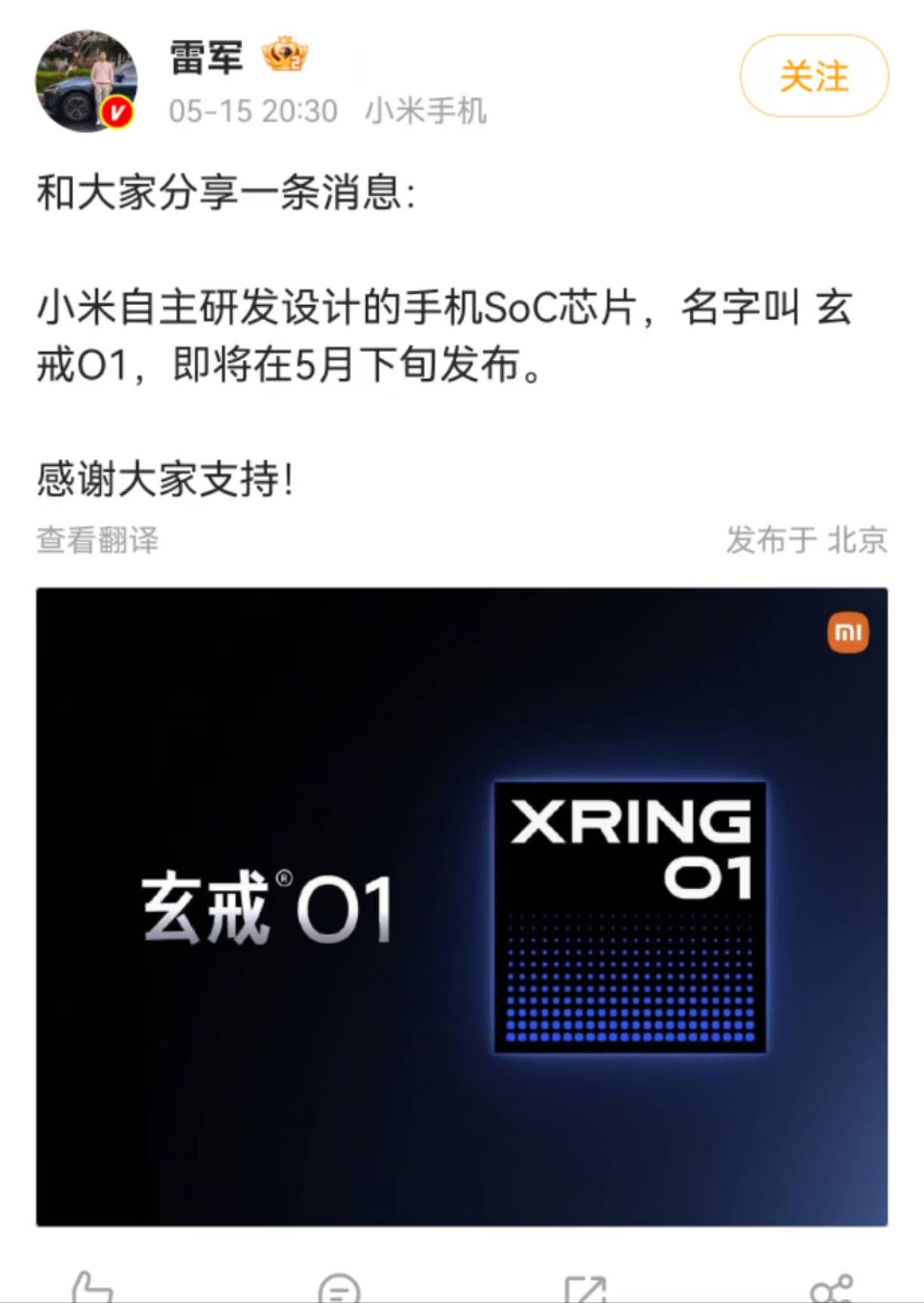 雷军官宣!小米自研手机芯片玄戒O1将在5月下旬发布