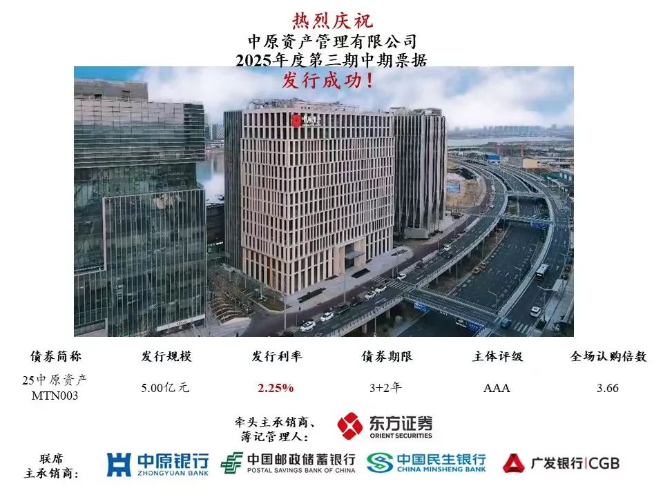 【大河财立方消息】5月16日,中原资产管理有限公司成功发行2025年度第三期中期票据,发行规模5亿元,期限3+2年,票面利率2.25%,全场认购倍数达3.66倍。