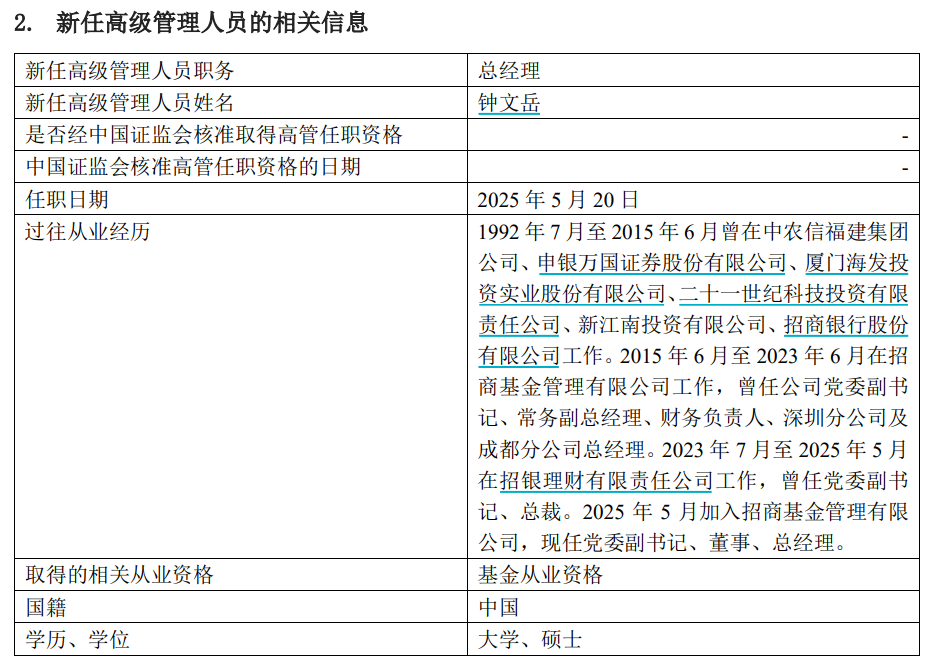 公告披露,招商基金总经理徐勇因个人原因离职,钟文岳新任招商基金总经理。