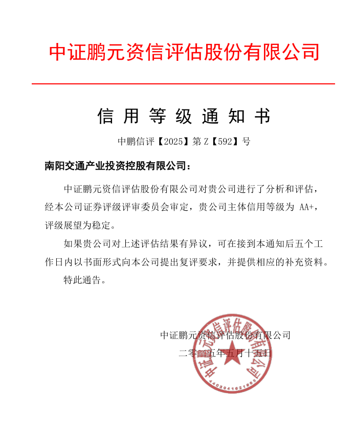 【大河财立方消息】5月21日消息,经中证鹏元综合评定,南阳交通产业投资控股有限公司近日获得AA+主体信用评级,评级展望为稳定。