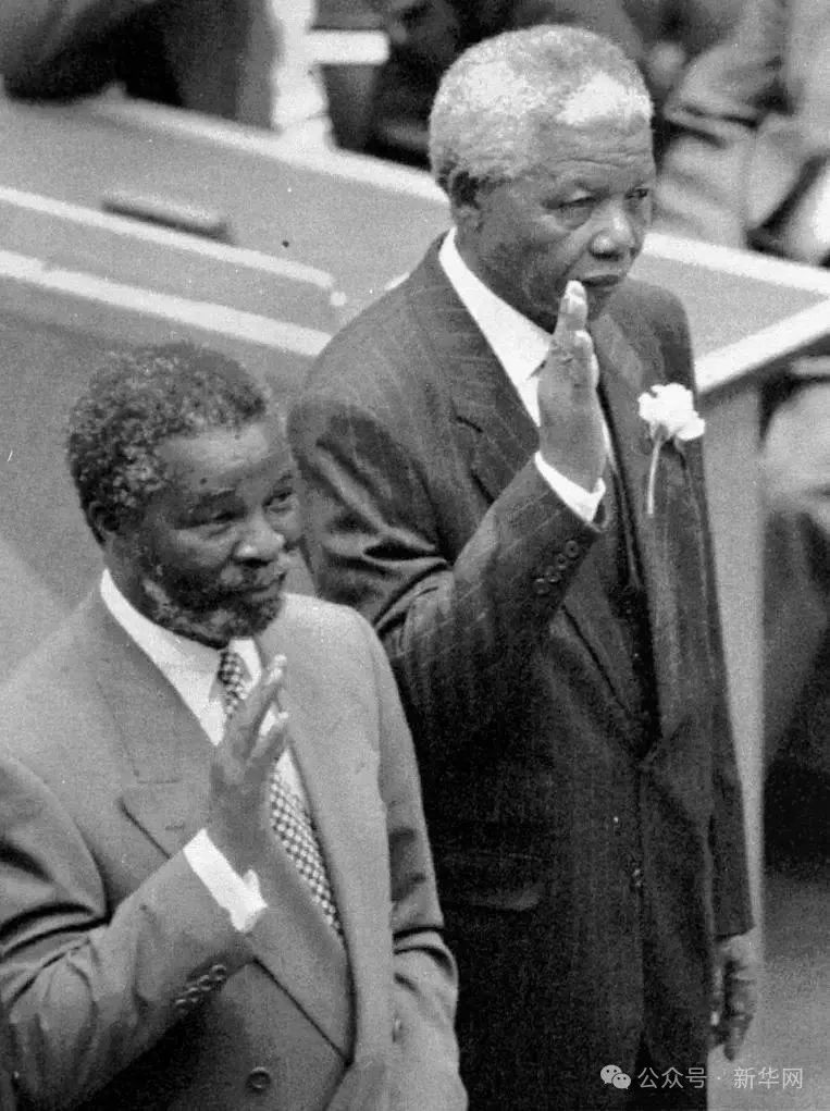 1994年5月9日,纳尔逊·曼德拉(右)在南非首次多种族大选中当选为南非历史上第一位黑人总统。新华社发