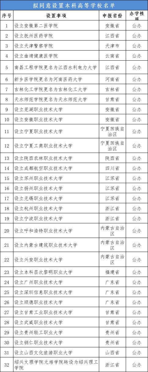5月22日,教育部发布关于拟同意设置本科高等学校的公示,经教育部党组会议审议,拟同意设置安徽第二医学院等32所学校。
