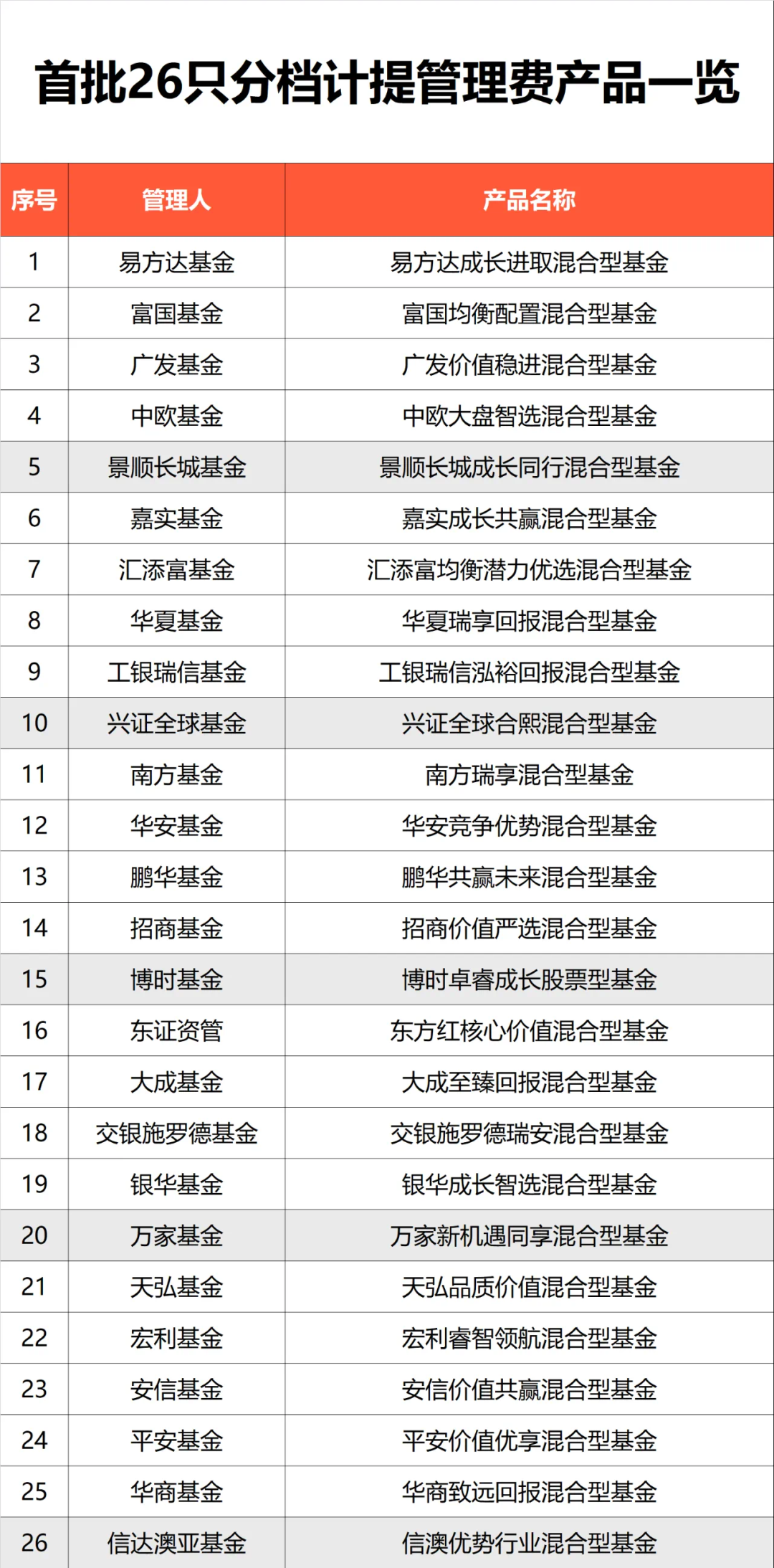 继5月16日首批产品申报后,5月23日,易方达、华夏、嘉实、广发、汇添富基金等基金公司上报的首批26只新型浮动管理费率基金获证监会注册,预计很快就会向投资者发售,投资者可通过商业银行、互联网平台等认购相关产品。