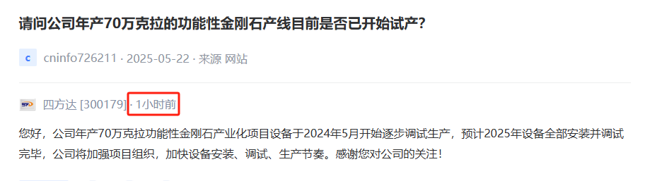 【大河财立方消息】5月26日,四方达在深交所投资者互动平台表示,公司年产70万克拉功能性金刚石产业化项目设备于2024年5月开始逐步调试生产,预计2025年设备全部安装并调试完毕,公司将加强项目组织,加快设备安装、调试、生产节奏。