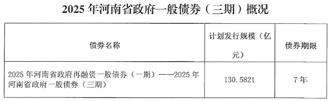 在国务院批准的总规模内,2025年河南省政府一般债券(三期)拟发行总额为130.5821亿元,期限为7年期,品种为记账式固定利率附息债券。7年期债券利息按年支付,发行后可按规定在全国银行间债券市场和证券交易所债券市场上市流通。