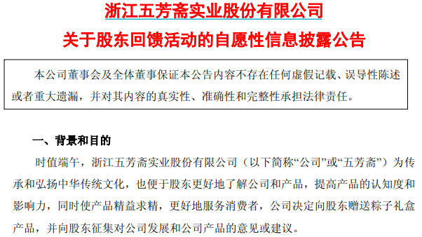 五芳斋表示,时值端午,公司为传承和弘扬中华传统文化,也便于股东更好地了解公司和产品,提高产品的认知度和影响力,同时使产品精益求精,更好地服务消费者,决定向股东赠送粽子礼盒产品,并向股东征集对公司发展和公司产品的意见或建议。