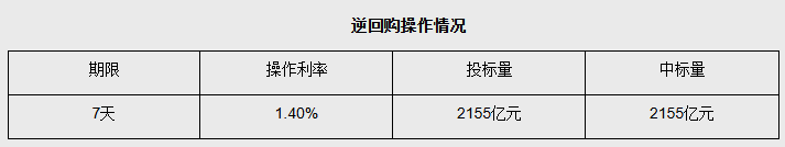 【大河财立方消息】5月28日,央行开展2155亿元7天期逆回购操作,投标量2155亿元,中标量2155亿元,操作利率为1.40%,与此前持平。今日有1570亿元逆回购到期,当日实现净投放585亿元。