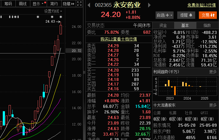 【大河财立方消息】5月28日,永安药业大涨持续,盘中一度涨停。截至上午收盘,永安药业股价上涨8.08%,报收24.20元/股。