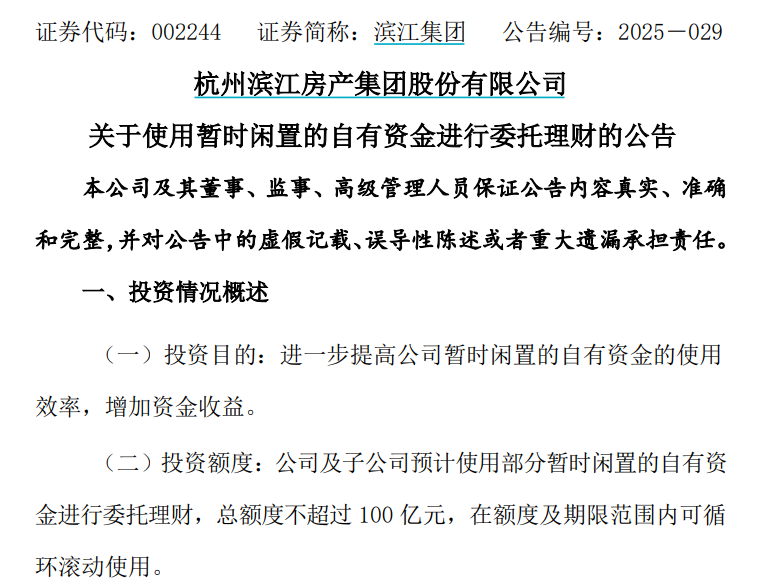 滨江集团:拟以不超100亿元暂时闲置自有资金委托理财