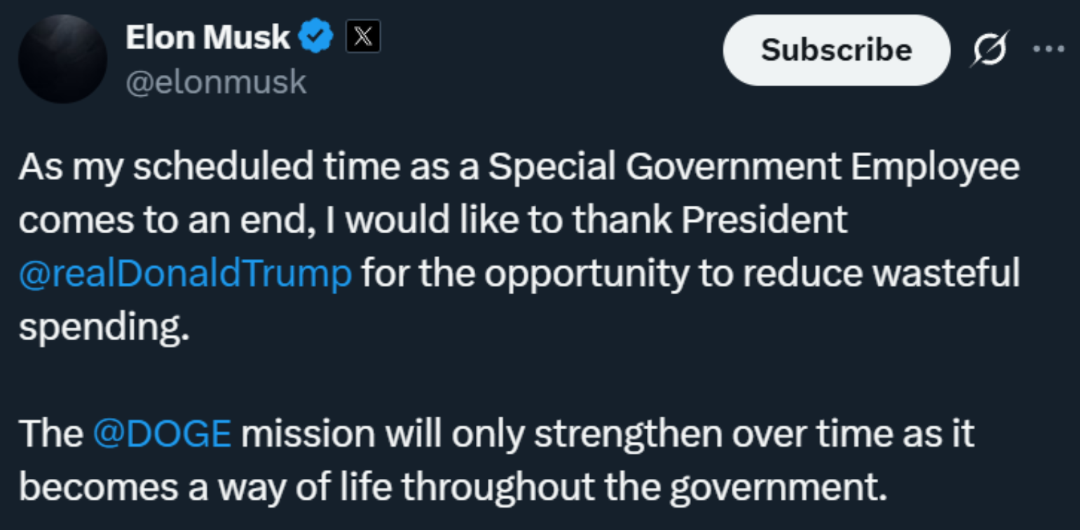 马斯克在其社交媒体平台X上发文表示,他即将离开特朗普政府,不再继续担任特别政府雇员一职。此外,马斯克在文中向美国总统特朗普致谢,并表示政府效率部(DOGE)团队将继续在整个政府范围内开展工作。