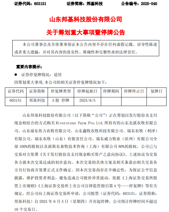 邦基科技称,正在筹划以发行股份及支付现金相结合的方式购买 Riverstone Farm Pte.Ltd.所持有的山东北溪农牧有限公司、山东瑞东伟力农牧有限公司、山东鑫牧农牧科技有限公司、瑞东农牧(利津)有限公司、瑞东农牧(山东)有限责任公司、瑞东威力牧业(滨州)有限公司全部100%的股权,以及派斯东畜牧技术咨询(上海)有限公司80%的股权,邦基科技已与交易对方签署《关于发行股份及支付现金购买资产之意向协议》。