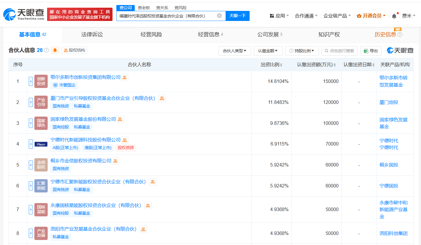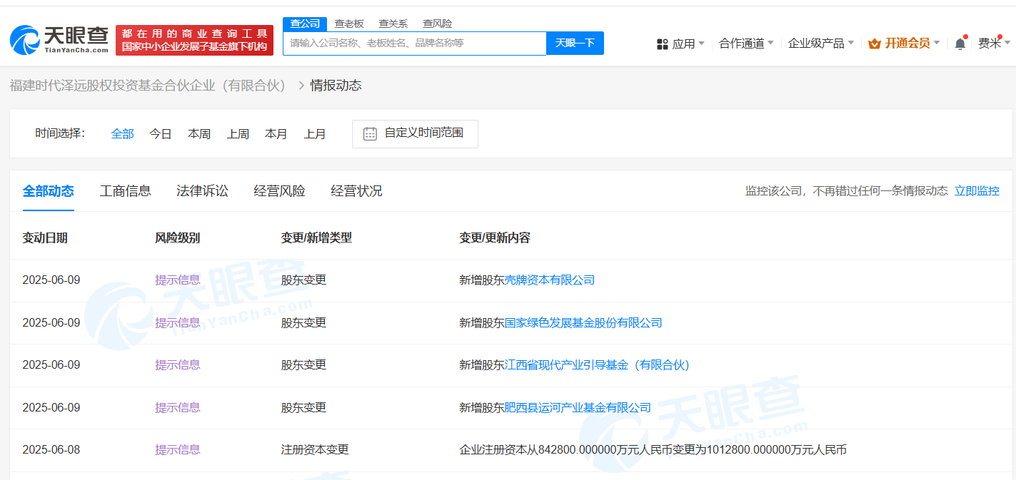 【大河财立方消息】6月10日消息,天眼查App显示,近日,福建时代泽远股权投资基金合伙企业(有限合伙)发生工商变更,新增国家绿色发展基金股份有限公司、江西省现代产业引导基金(有限合伙)、壳牌资本有限公司、肥西县运河产业基金有限公司为合伙人,同时出资额由84.28亿人民币增至101.28亿人民币。