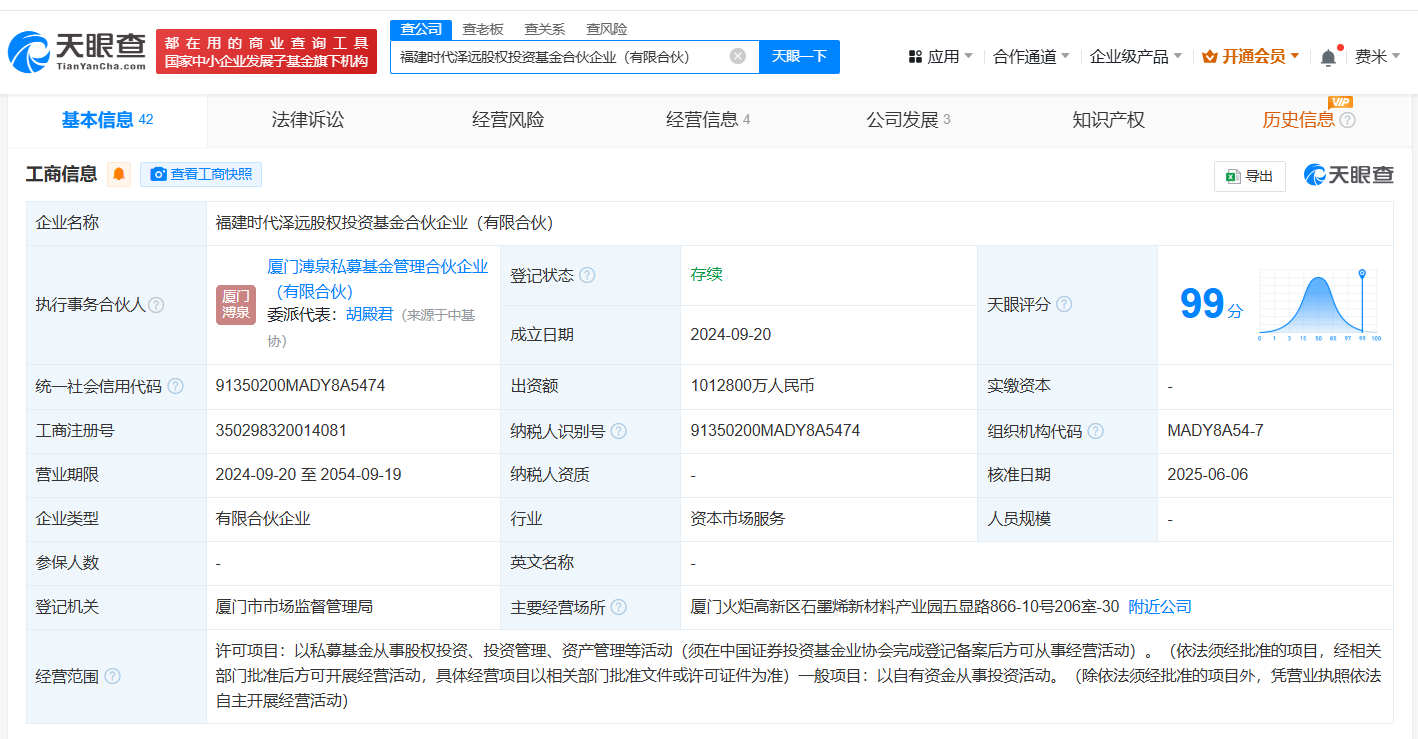 福建时代泽远股权投资基金合伙企业(有限合伙)成立于2024年9月,执行事务合伙人为厦门溥泉私募基金管理合伙企业(有限合伙),经营范围为以私募基金从事股权投资、投资管理、资产管理等活动,以自有资金从事投资活动,现由厦门市产业引导股权投资基金合伙企业(有限合伙)、宁德时代新能源科技股份有限公司及上述新增合伙人等共同出资。