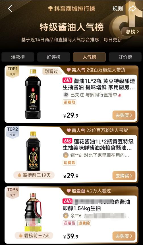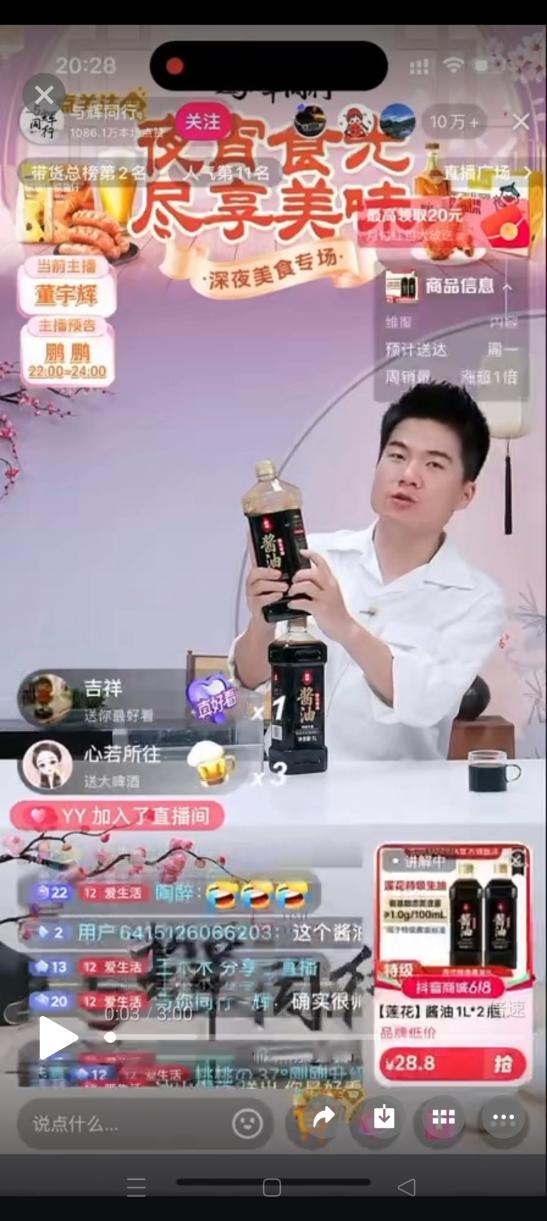 在6月13日的直播中,董宇辉以其标志性的文化解读方式,从酱油,到鲜味的来源、鲜味的传承,再到莲花味精曾经被误解,以及人们对鲜味的执着,解读中国人饮食的鲜文化。当晚同时在线人数10万+,莲花酱油蝉联平台酱油类目排行榜首。