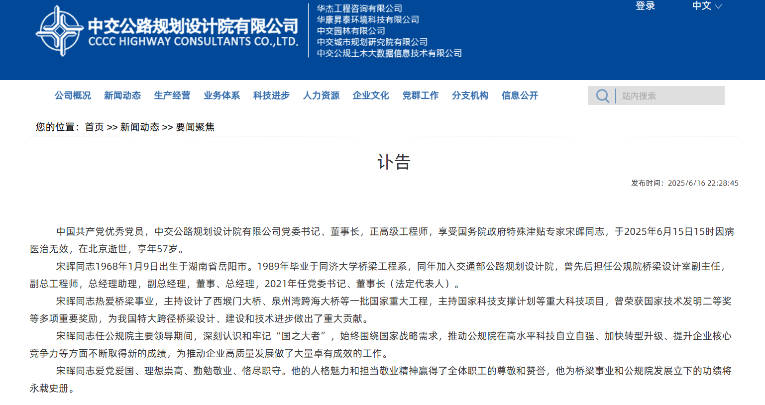 【大河财立方消息】6月16日,中交公路规划设计院有限公司发布讣告:中交公路规划设计院有限公司党委书记、董事长,正高级工程师,享受国务院政府特殊津贴专家宋晖同志,于2025年6月15日15时因病医治无效,在北京逝世,享年57岁。