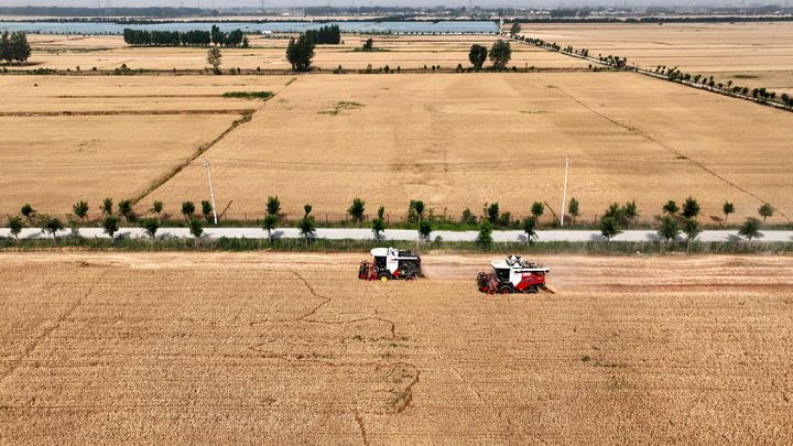 2025年6月12日,在青岛西海岸新区大场镇的麦田里,联合收割机在收割小麦(无人机照片)。新华社记者 李紫恒 摄