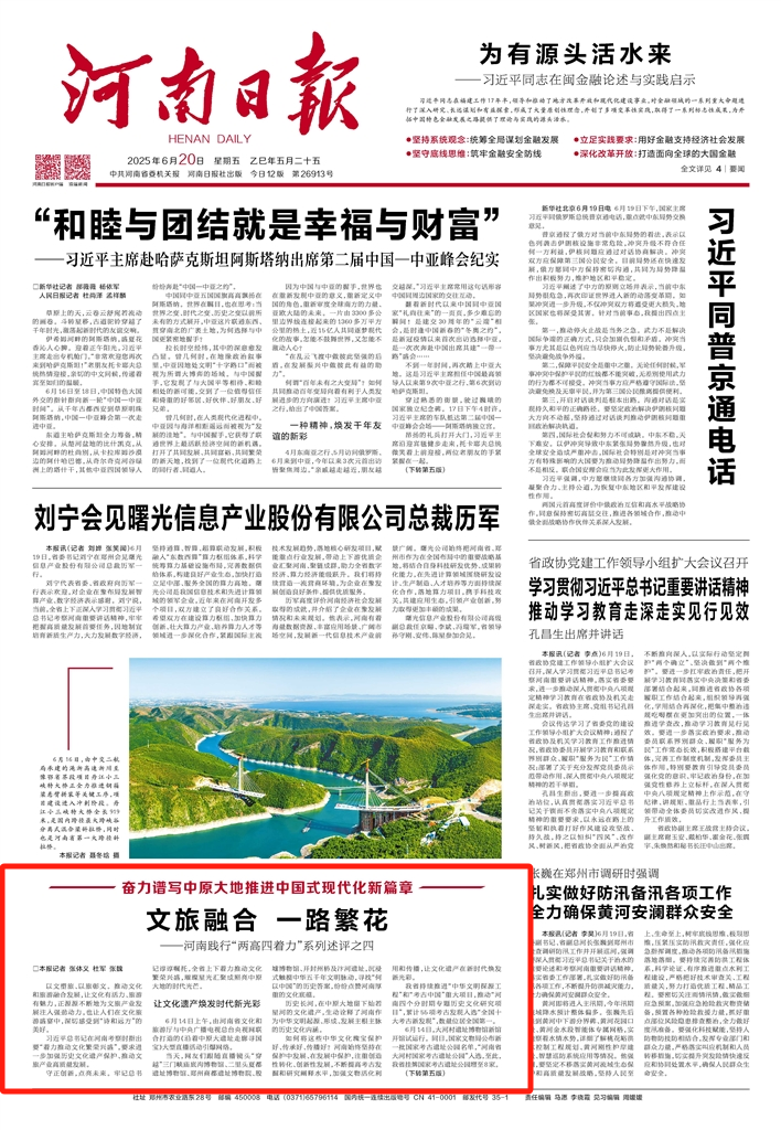 以资源禀赋构筑竞争高地,以创新驱动激活发展动能。河南厚植文化优势,在做好保护传承的基础上,繁荣文艺创作,提升文旅产业能级,不断开创文化繁荣兴盛新局面,奋力谱写中原大地推进中国式现代化新篇章。