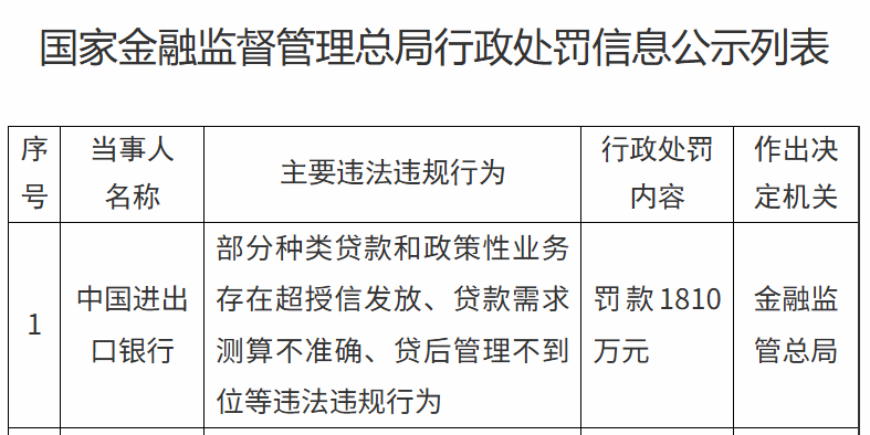 【大河财立方消息】6月27日,国家金融监管总局披露的行政处罚信息显示,中国进出口银行因部分种类贷款和政策性业务存在超授信发放、贷款需求测算不准确、贷后管理不到位等违法违规行为,被罚1810万元。