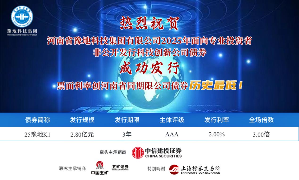 【大河财立方 记者 吴春波】6月30日,大河财立方记者从豫地科技集团获悉,该集团首期科技创新公司债券已于6月26日在上海证券交易所成功发行,本期债券发行规模为2.8亿元,发行期限3年,票面利率2.0%,创河南省同期限公司债券历史最低,进一步体现了资本市场对该集团科创实力及信用水平的认可。