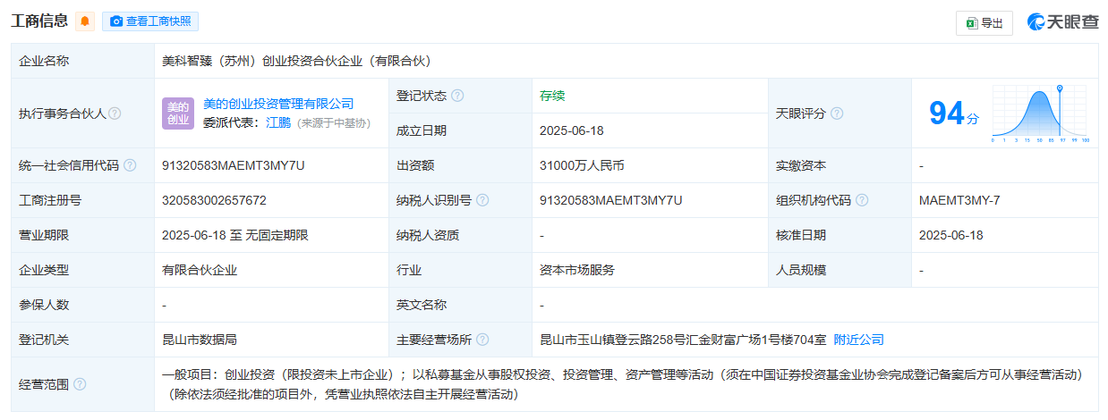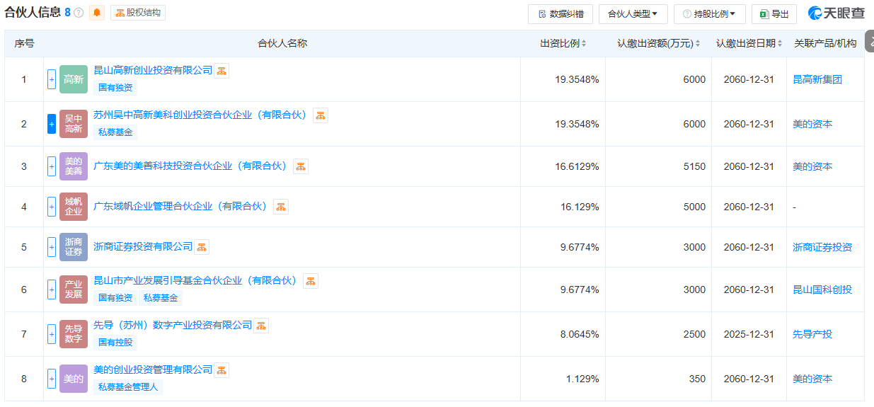合伙人信息显示,该合伙企业由昆山高新创业投资有限公司、苏州吴中高新美科创业投资合伙企业(有限合伙)、广东美的美善科技投资合伙企业(有限合伙)等共同出资。
