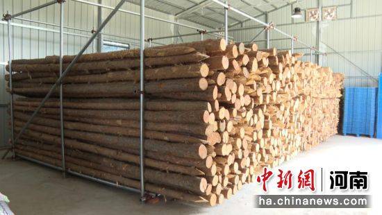 图为仓库内整齐摆放的防汛木桩。固始县融媒体中心供图