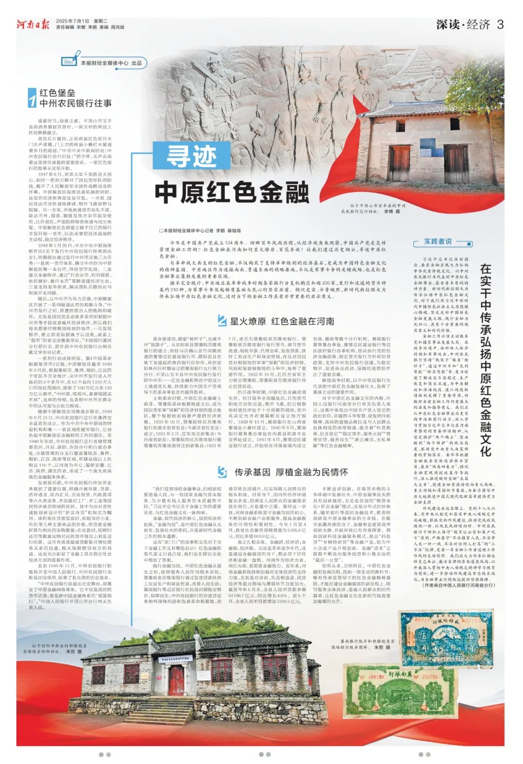 知所从来,方明所往。中原红色金融的发展历程,犹如一部生动的教科书:唯有传承党领导下的红色金融精神基因,才能在建设金融强国的新征程上,续写服务实体经济、造福人民群众的时代篇章,让红色金融文化在新时代绽放更加璀璨的光芒。