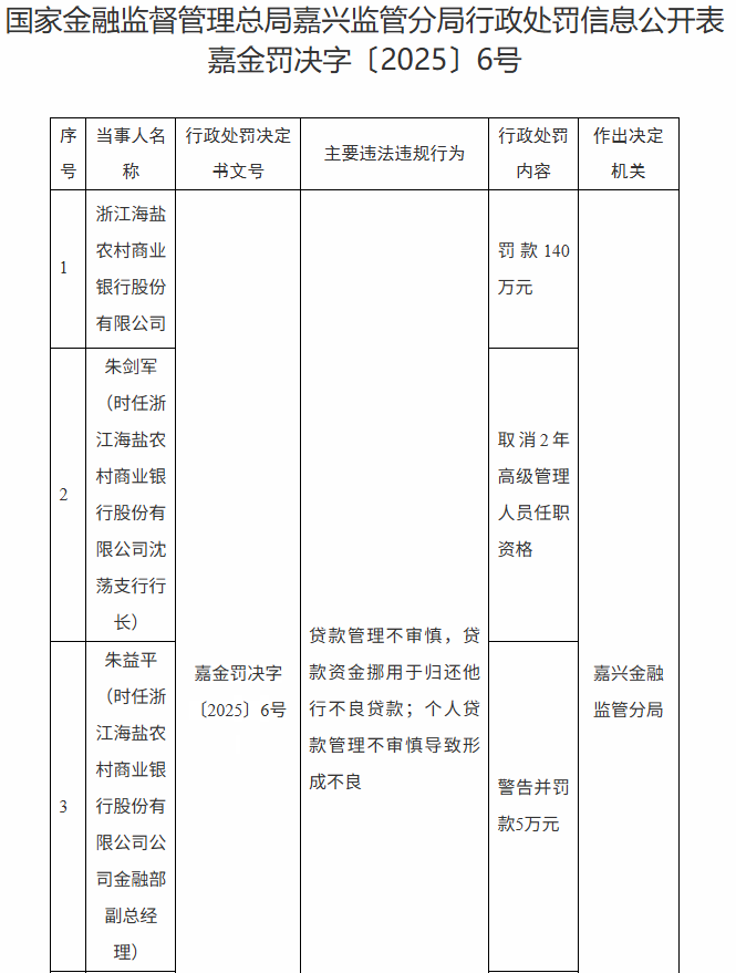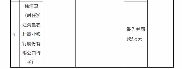 时任海盐农商银行沈荡支行行长朱剑军被取消2年高级管理人员任职资格;时任海盐农商银行行长朱益平、时任公司金融部副总经理徐海卫受到警告处分,并分别被罚5万元。
