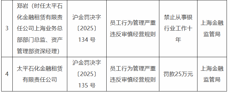 【大河财立方消息】7月3日消息,国家金融监督管理总局上海监管局一则行政处罚信息公开表显示,因员工行为管理严重违反审慎经营规则,太平石化金融租赁有限责任公司被罚25万元。