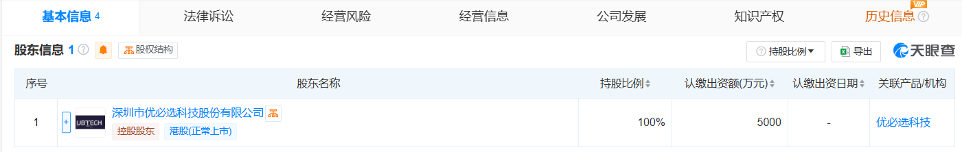 股东信息显示,该公司由深圳市优必选科技股份有限公司全资持股。