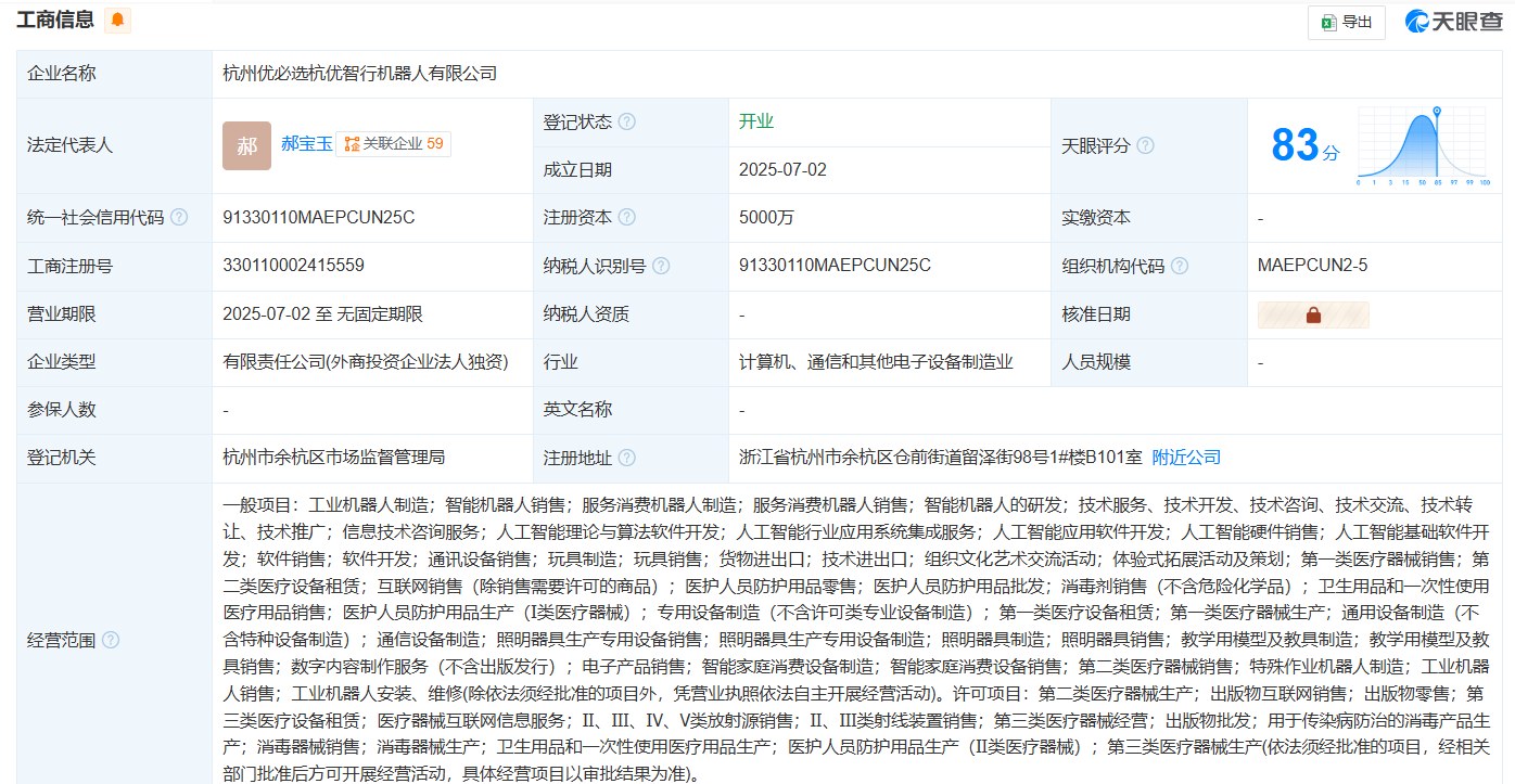 【大河财立方消息】7月3日,据天眼查App,近日,杭州优必选杭优智行机器人有限公司成立。法定代表人为郝宝玉,注册资本为5000万元,经营范围包括工业机器人制造,智能机器人销售,服务消费机器人制造,人工智能理论与算法软件开发、人工智能行业应用系统集成服务等。