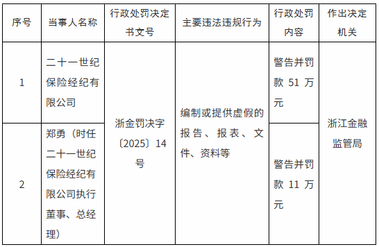 【大河财立方消息】7月4日,国家金融监督管理总局浙江监管局披露行政处罚信息,因编制或提供虚假的报告、报表、文件、资料等,二十一世纪保险经纪有限公司被警告并罚款51万元,时任该公司执行董事、总经理郑勇被警告并罚款11万元。