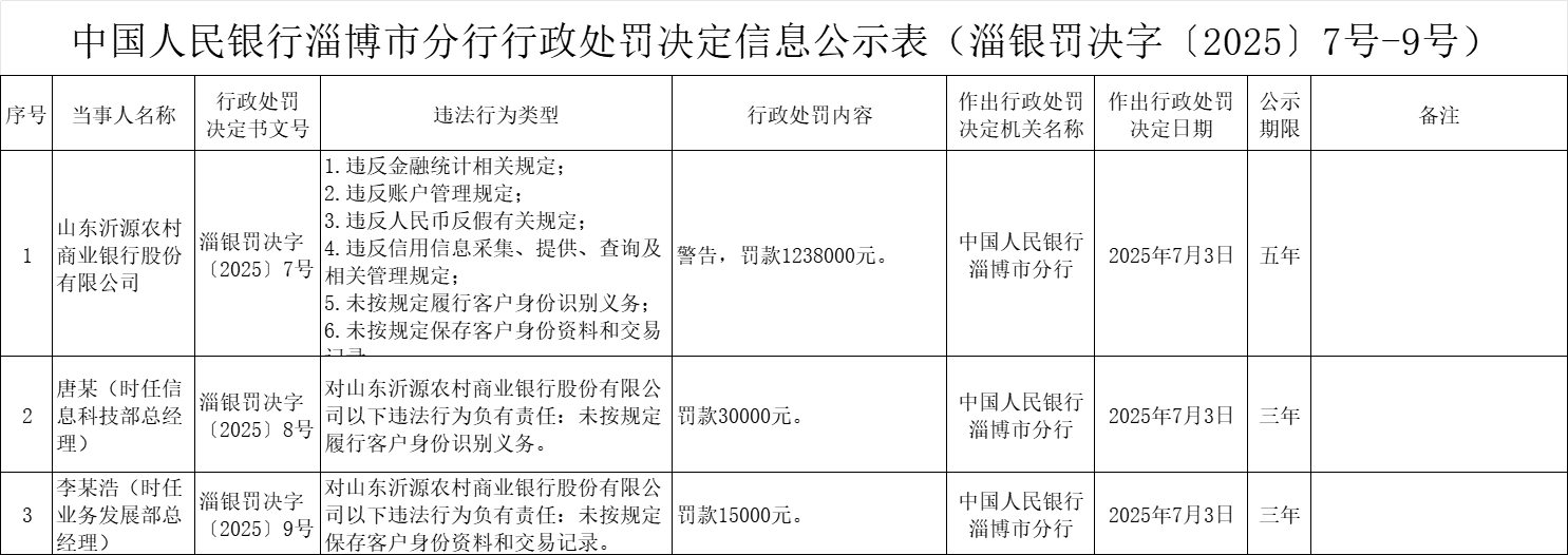 【大河财立方消息】7月5日消息,中国人民银行淄博市分行披露行政处罚决定信息。山东沂源农村商业银行因存在多项违法行为,被警告并罚款123.80万元。