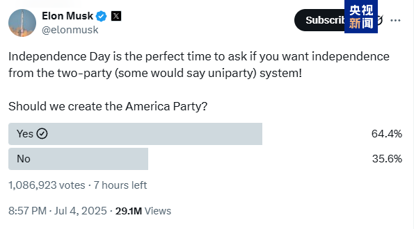 在美国总统特朗普7月4日将“大而美”法案签署成法的几个小时前,特朗普的前盟友、企业家埃隆·马斯克通过社交平台发起了一项关于成立美国新政党的投票。