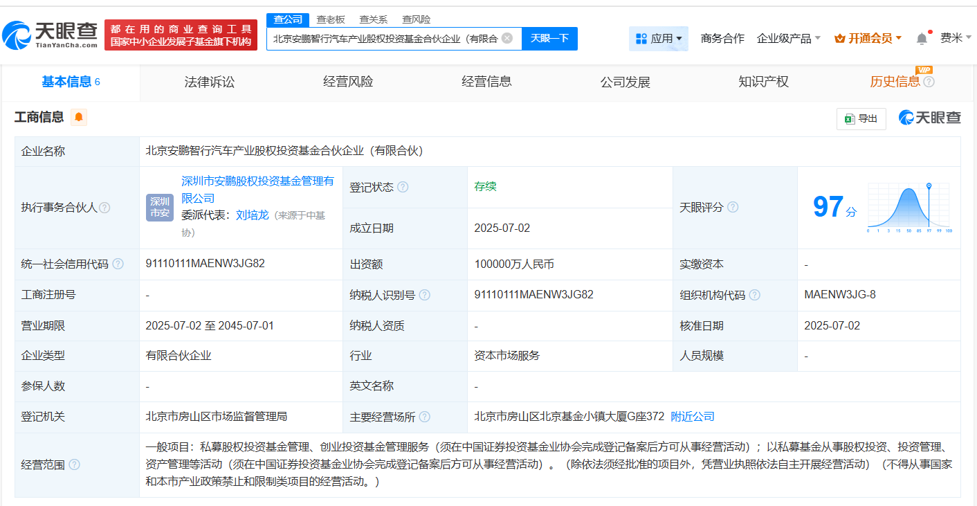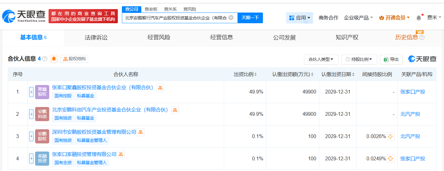 合伙人信息显示,该基金由北汽集团旗下北京安鹏科创汽车产业投资基金合伙企业(有限合伙)、深圳市安鹏股权投资基金管理有限公司、张家口聚鑫股权投资基金合伙企业(有限合伙)、张家口家融投资管理有限公司共同出资。
