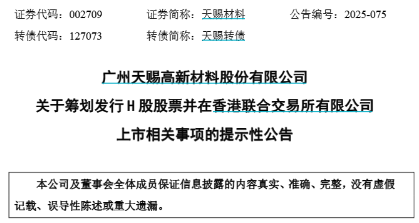 【大河财立方消息】7月7日,广州天赐高新材料股份有限公司(证券简称天赐材料)发布公告称,筹划发行H股股票并在香港联合交易所有限公司上市。