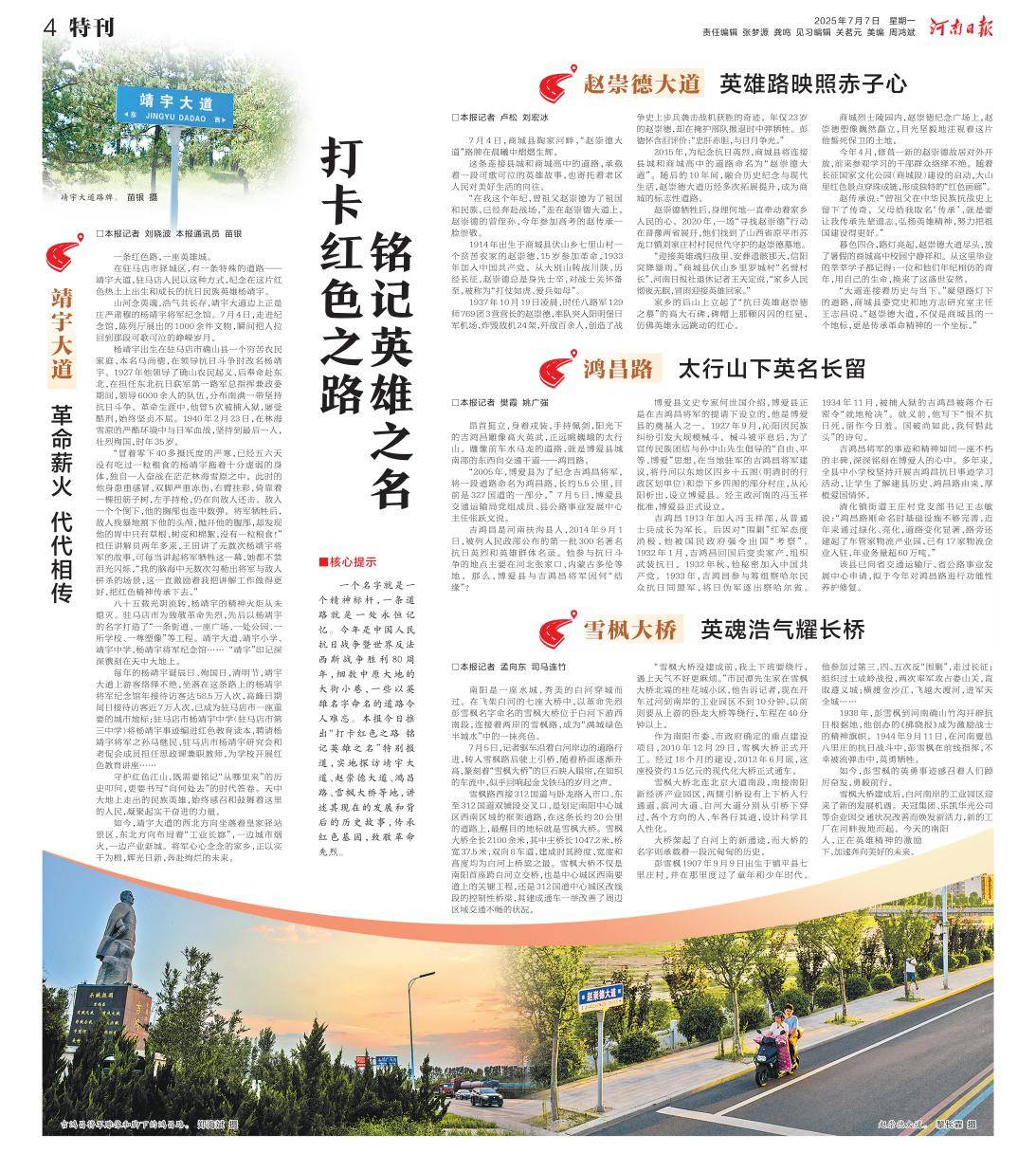核心提示丨一个名字就是一个精神标杆,一条道路就是一处永恒记忆。今年是中国人民抗日战争暨世界反法西斯战争胜利80周年,细数中原大地的大街小巷,一些以英雄名字命名的道路令人难忘。本报今日推出“打卡红色之路 铭记英雄之名”特别报道,实地探访靖宇大道、赵崇德大道、鸿昌路、雪枫大桥等地,讲述其现在的发展和背后的历史故事,传承红色基因,致敬革命先烈。