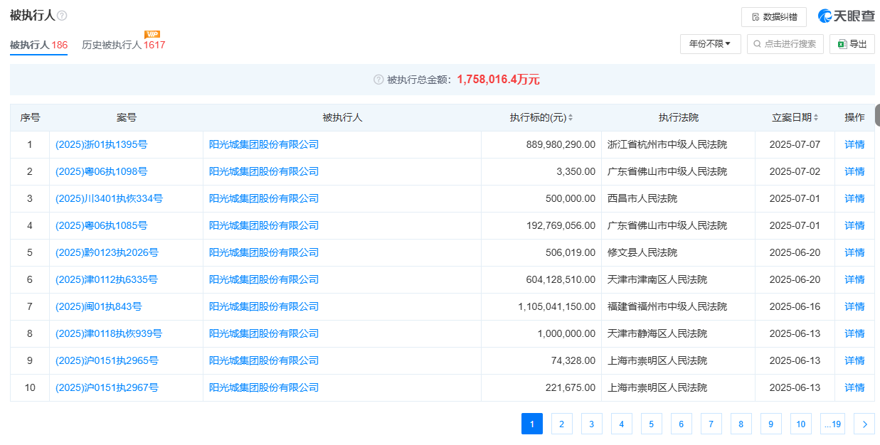 风险信息显示,阳光城集团股份有限公司现存186条被执行人信息,被执行总金额175亿余元,此外,该公司还存在多条限制消费令、失信被执行人及终本案件信息。